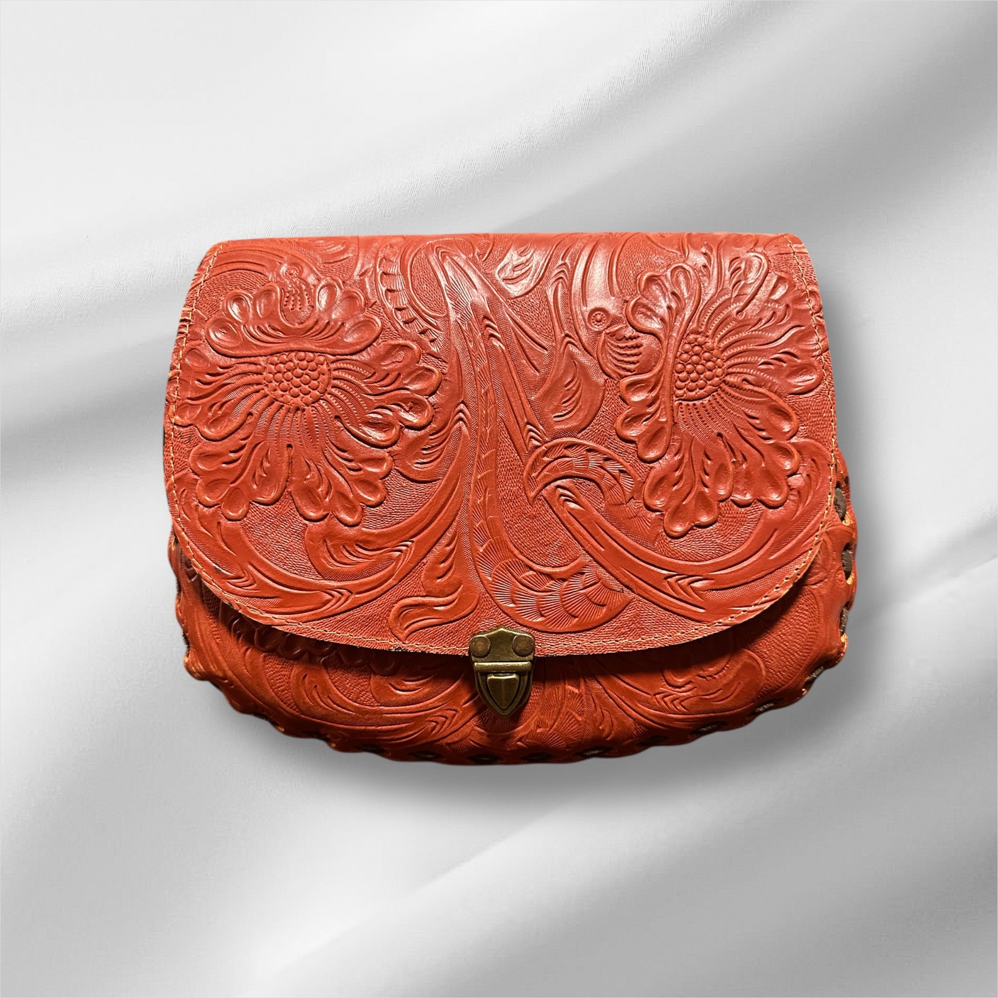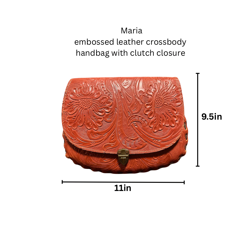 Crafted from genuine leather, this crossbody bag features intricate hand-tooled floral detailing in a bold red finish. Designed with a secure clasp closure and crossbody strap, it blends western elegance with everyday versatility. A timeless statement piece full of character and craftsmanship.