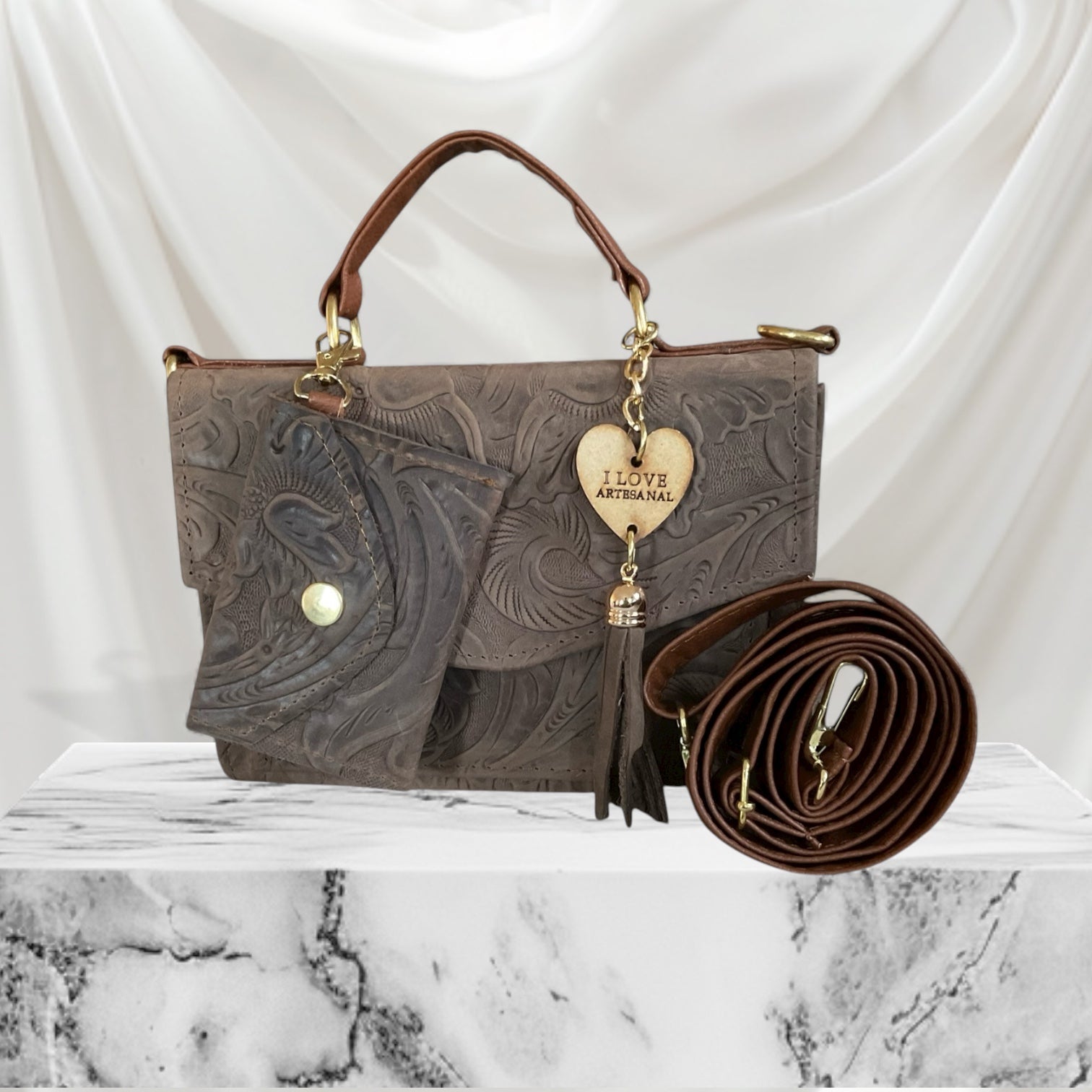 Crafted from 100% genuine leather, this small handbag showcases exquisite hand-tooled floral designs inspired by traditional craftsmanship from León, Guanajuato. Compact yet versatile, it features a detachable strap for crossbody or handheld wear, and gold-tone accents that add a refined touch. Perfect for everyday elegance with a touch of Mexican artistry.